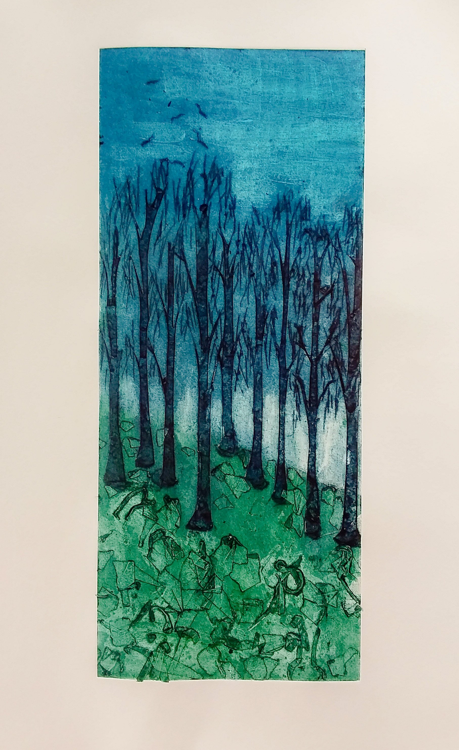 First attempt at collagraph printmaking. The printing plate is made of card, which I then cut with a stanley knife and ripped to make the tree trunks. The foreground is a collage of ripped bits of card and scrunched up masking tape. Then I inked up the plate and this was the result. Now I want to do more!